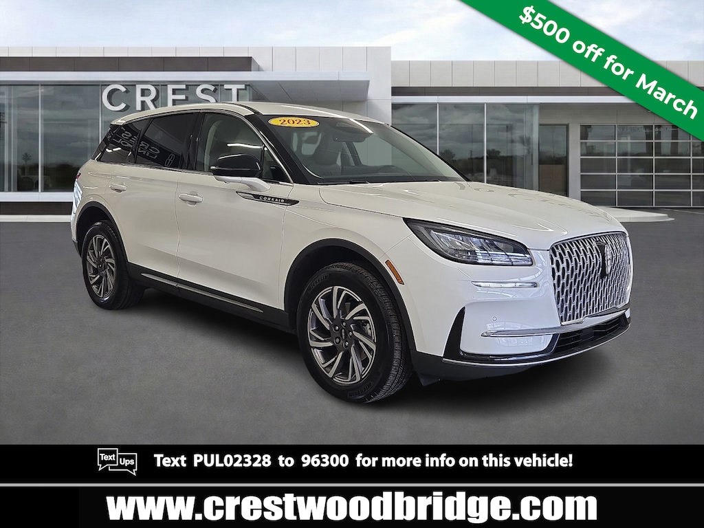 This Certified 2023 Lincoln Corsair sweeps onto the scene like a polished little superstar that knows exactly how to seal your attention without raising its voice. It glides rather than drives carrying itself with the quiet confidence of a luxury lounge on wheels its chrome accents twinkling like theyve been rehearsing for a spotlight debut. This Corsair is a compact luxury charmer that sparkles with flair coasts with elegance and rides with the playful confidence of a vehicle that knows its fabulous! 360 Degree Camera Rear Parking Sensors Heated and Cooled Front Seats Heated Steering Wheel Front Parking Aid Lane-Keeping System and much more! All pricing and details provided are believed to be accurate but we do not warrant or guarantee such accuracy. The prices shown above may vary from region to region as will incentives and are subject to change. New vehicles offered may be eligible for manufacturer incentives which may change at any time and are subject to incentive qualification criteria and requirements and which may be contingent upon manufacturer finance company approval. Manufacturer incentive data and vehicle features information is provided by third parties and believed to be accurate as of the time of publication. Vehicle information is based upon standard equipment and may vary from vehicle to vehicle. Please contact the dealership.